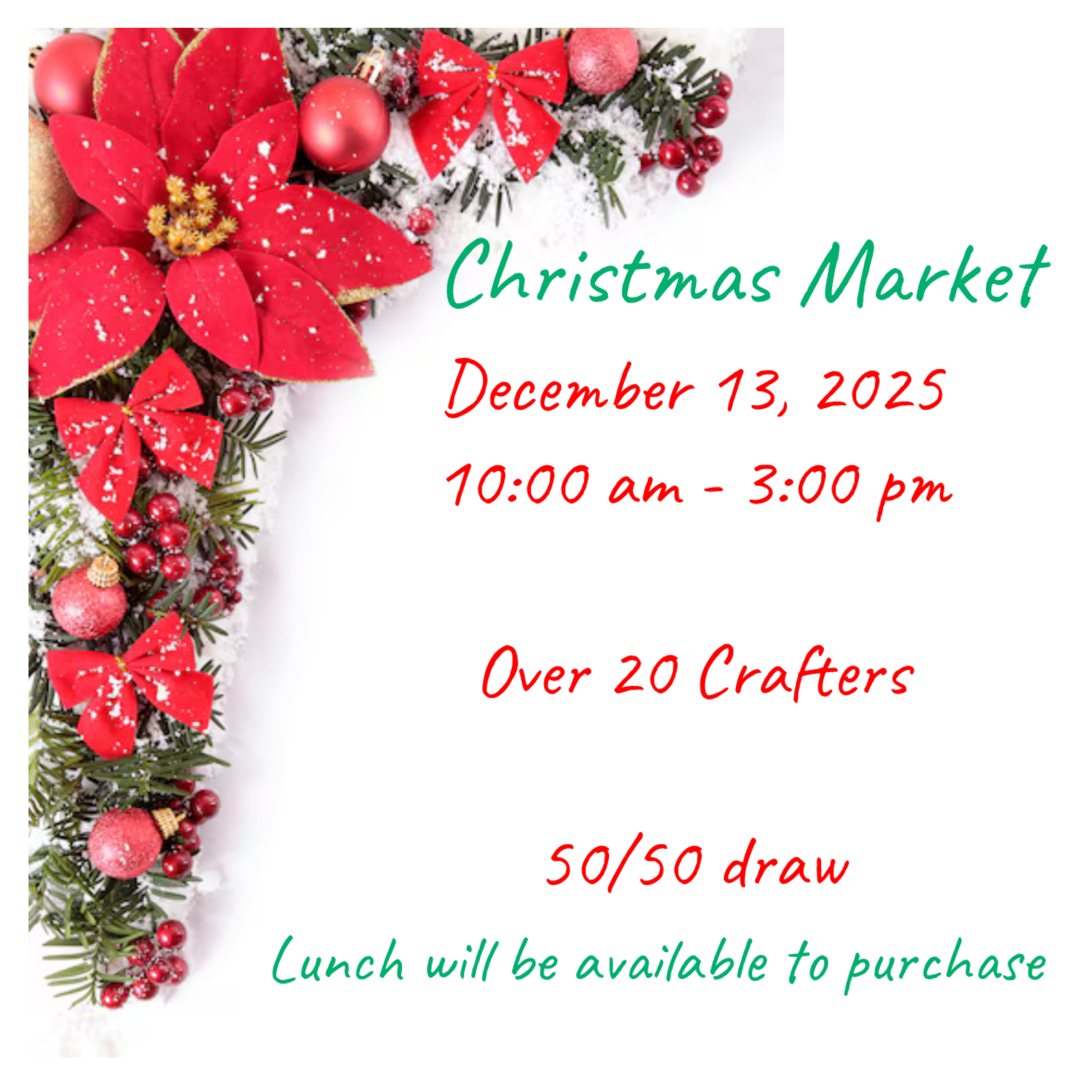 Come join us for our annual Christmas Market, get your last minute Christmas Shopping done. We will have some amazing vendors to shop from. Lunch will be available to purchase. There will be a 50/50 draw.